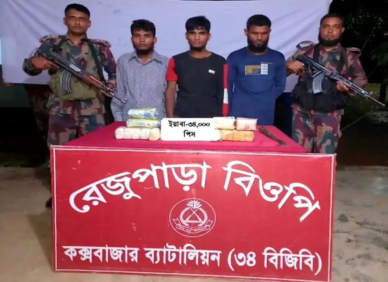 🟩 তাদের কাছ থেকে উদ্ধার হয় ৩৪ হাজার পিস ইয়াবা ও একটি রামদা