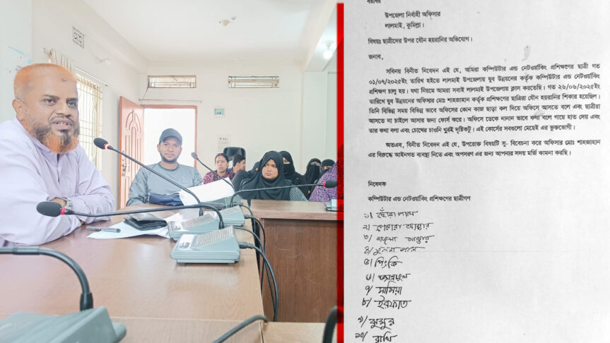 অভিযোগসূত্রে জানা যায়, গত ১লা জুলাই, ২০২৫খ্রি. হতে শুরু হওয়া ভ্রাণমান্য কম্পিউটার এন্ড নেটওয়ার্কিং প্রশিক্ষণে আসা নারী শিক্ষার্থীদের একেক সময় একদিন তার অফিস রুমে ডেকে নানা প্রকার অশ্লীল ভাষায় কথা বলা, যৌন হয়রানি, শ্লীলতাহানি ও মানসিক নির্যাতন করা হয় এবং কি শরীরের বিভিন্ন স্পর্শকাতার জায়গায় টাচ্ করে যৌন হয়রানি করার মতো গুরুতর অভিযোগ লালমাই উপজেলা যুব উন্নয়ন অফিসার মোহাম্মদ শাহজাহানের বিরুদ্ধে।
