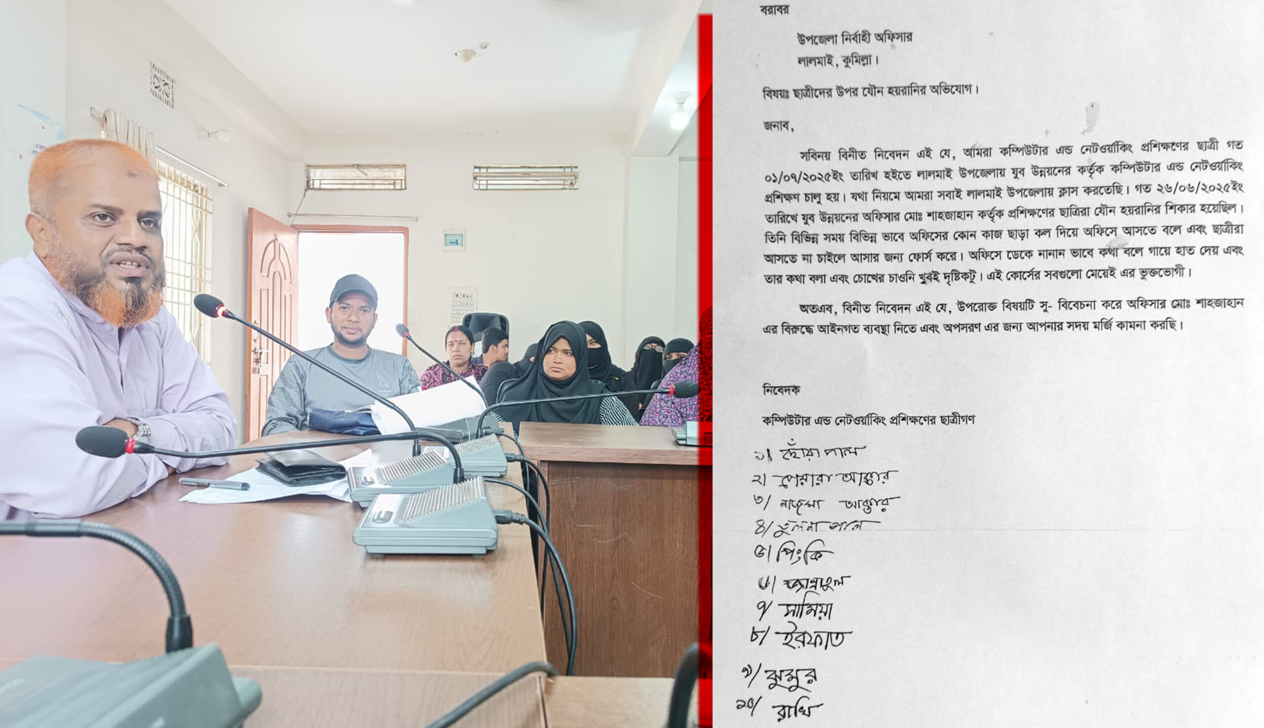 মিল্লা লালমাই উপজেলা যুব উন্নয়ন অফিসার মোহাম্মদ শাহজাহান বিরুদ্ধে প্রশিক্ষণরত নারী শিক্ষার্থীদের যৌন হয়রানি, শ্লীলতাহানি ও মানসিক নির্যাতন করার অভিযোগ । ভ্রাণমান্য কম্পিউটার এন্ড নেটওয়ার্কিং প্রশিক্ষণরত নারী শিক্ষার্থীদের যৌন হয়রানি, শ্লীলতাহানি ও মানসিক নির্যাতন করার অভিযোগ এনেছেন প্রশিক্ষণরত নারী শিক্ষার্থীরা ।